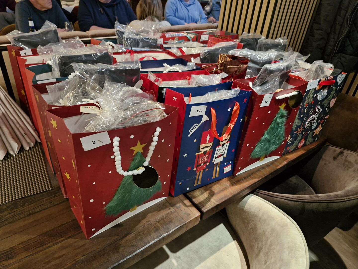 Wie auch im letzten Jahr haben Conny und Hermann diverse Sponsoren abgeklappert und wertvolle Geschenkartikel und Gutscheine eingesammelt, um sie an diesem Abend zu verlosen. Wie auch beim letzten Mal hatte Herman eine Schüssel mit Papierröllchen dabei, wovon jeder eines ziehen konnte. Darauf waren Nummern gedruckt, die wiederum jeweils zu einer Tasche voller Überraschungen gehörten. Jeder Einzelne bekam eine solche Tüte, in der die unterschiedlichsten Präsente zu finden waren. Hier sei ein ausdrücklicher Dank den Sponsoren und den Kreativen unter uns ausgesprochen, die das möglich gemacht haben. Zu finden waren unter anderem selbstgemachte Bilder und Basteleien, alles Unikate!